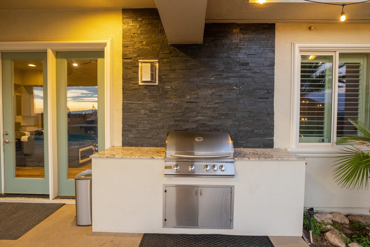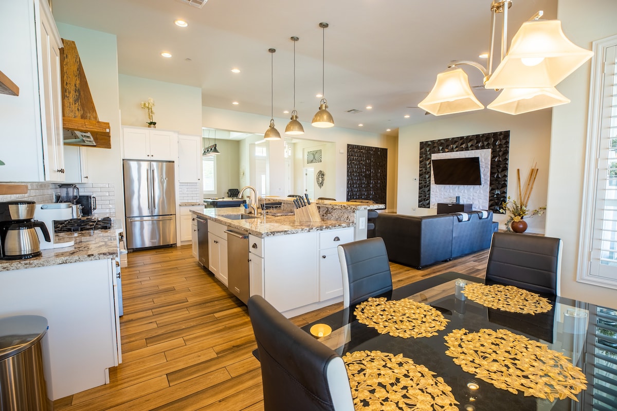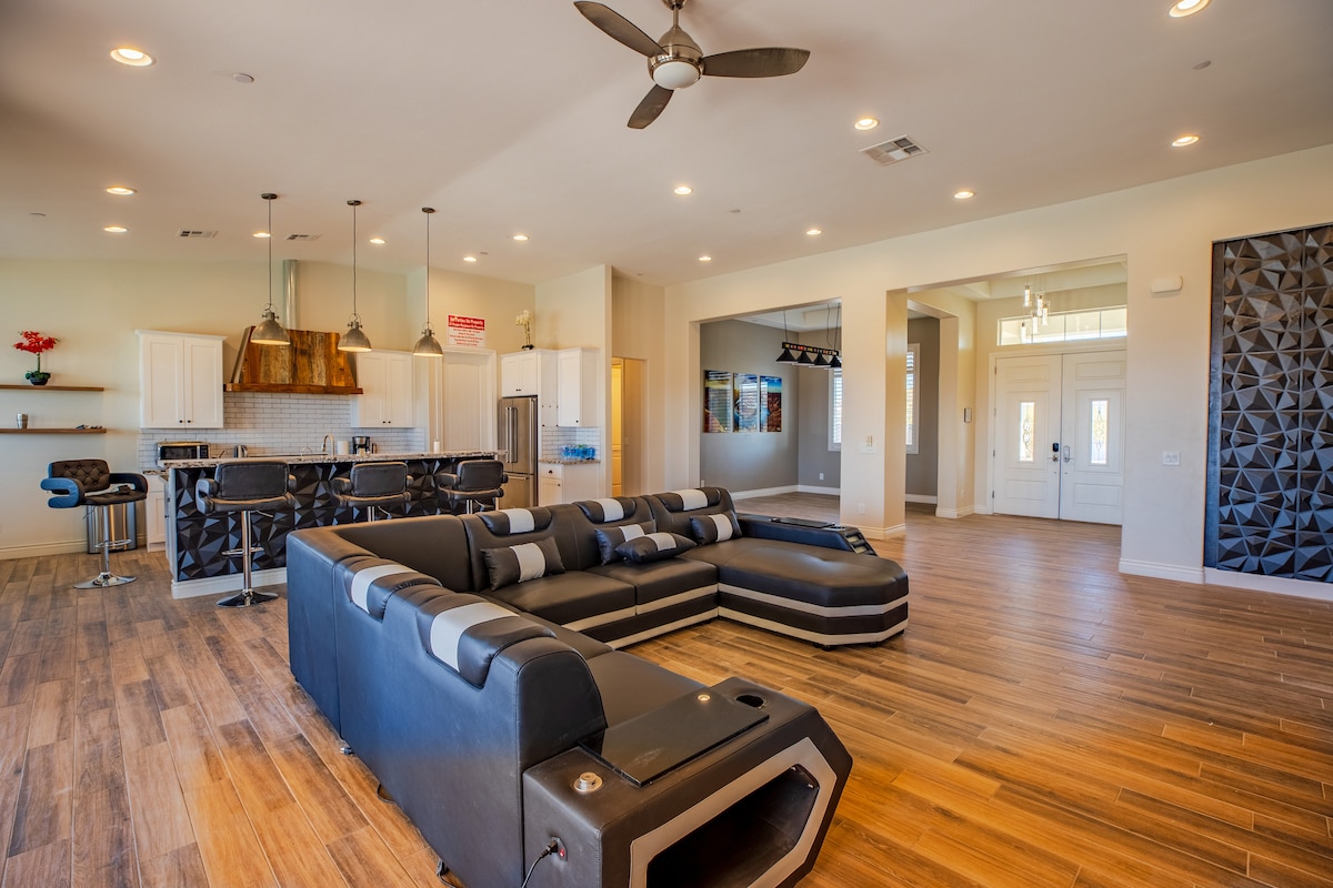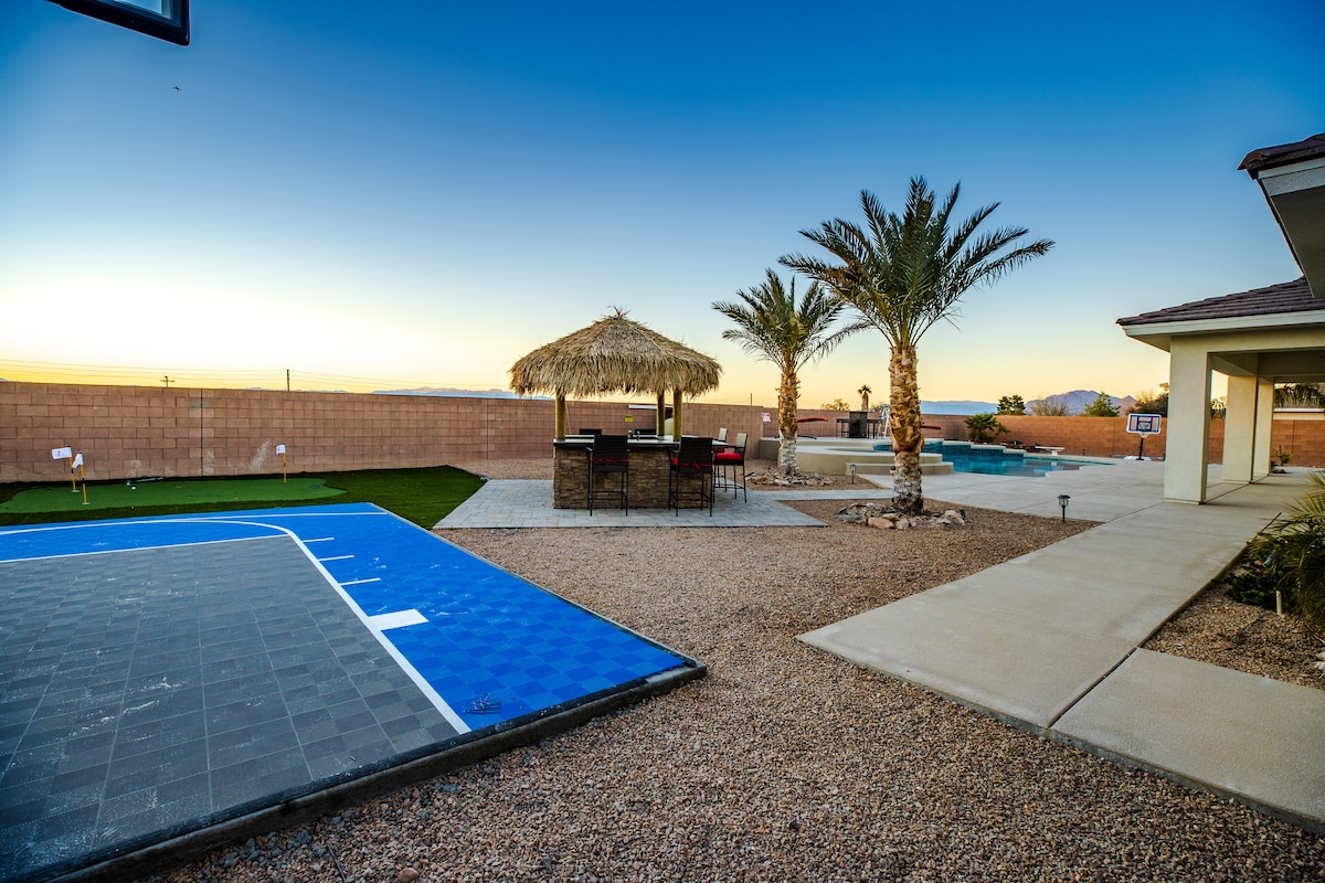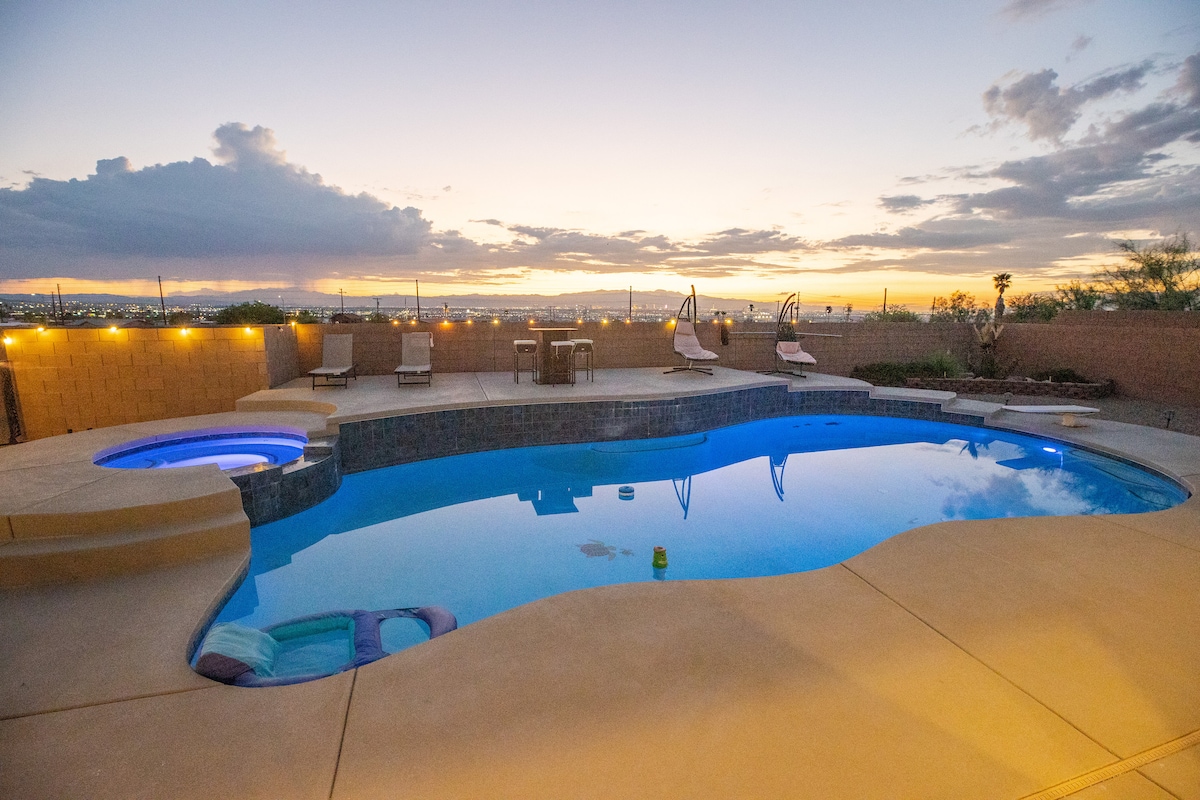HendersonWelcome to my modern completely remodeled 3400 square foot house! Strip views from the backyard, master bedroom and living room. Very spacious and accommodates up to 12 people comfortably. 40 foot heatable pool and jacuzzi. Basketball court, golf putting green and a huge kitchen island. Has 5 bedrooms with 4 of them having an in suite personal bathroom. High speed internet and a basic cable subscription. Each Bedroom has it's own smart TV and the living room has a huge smart TV.