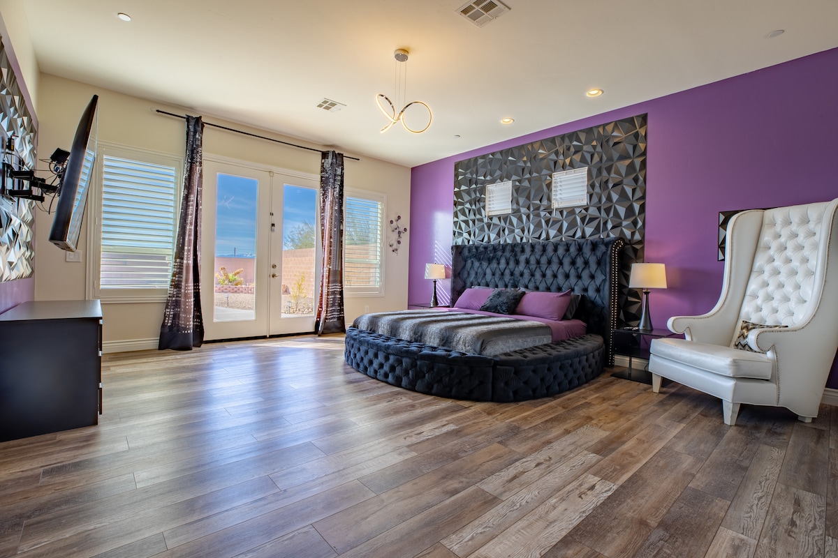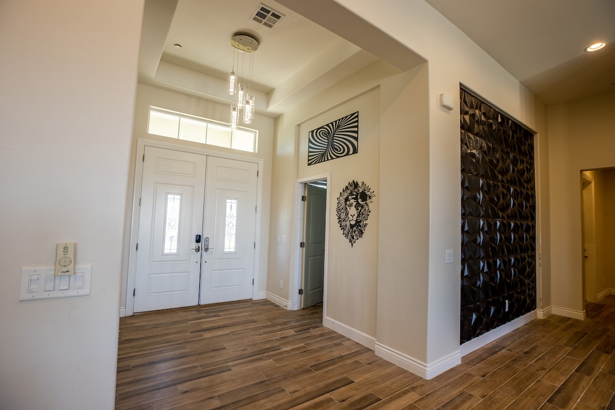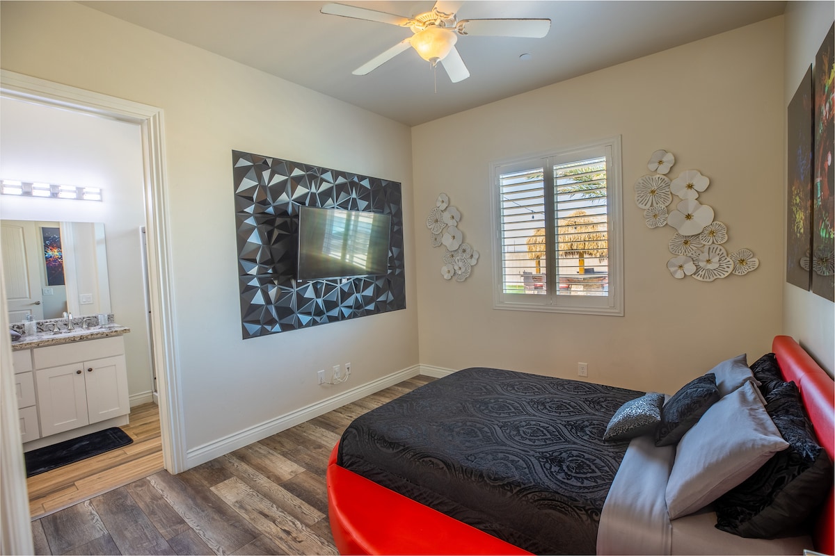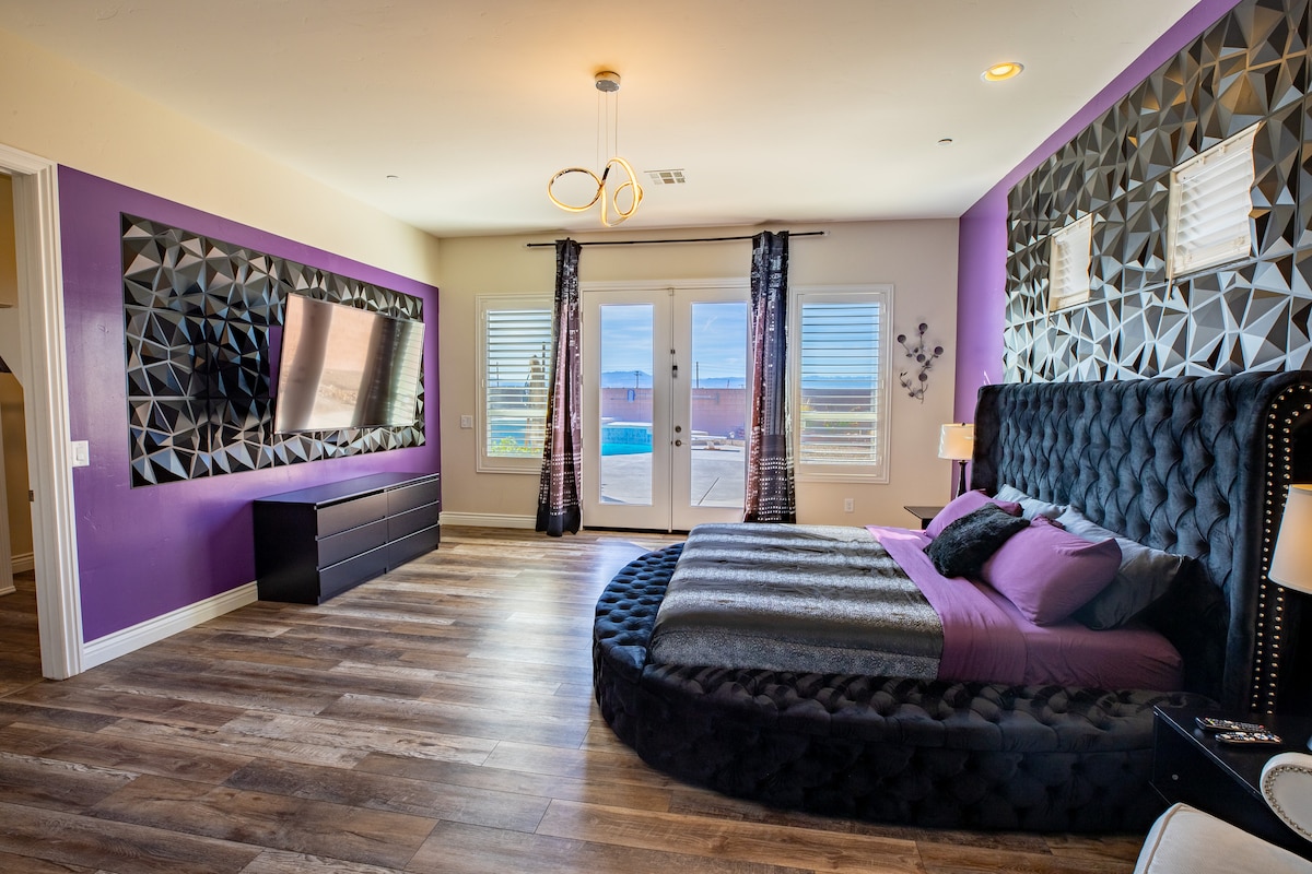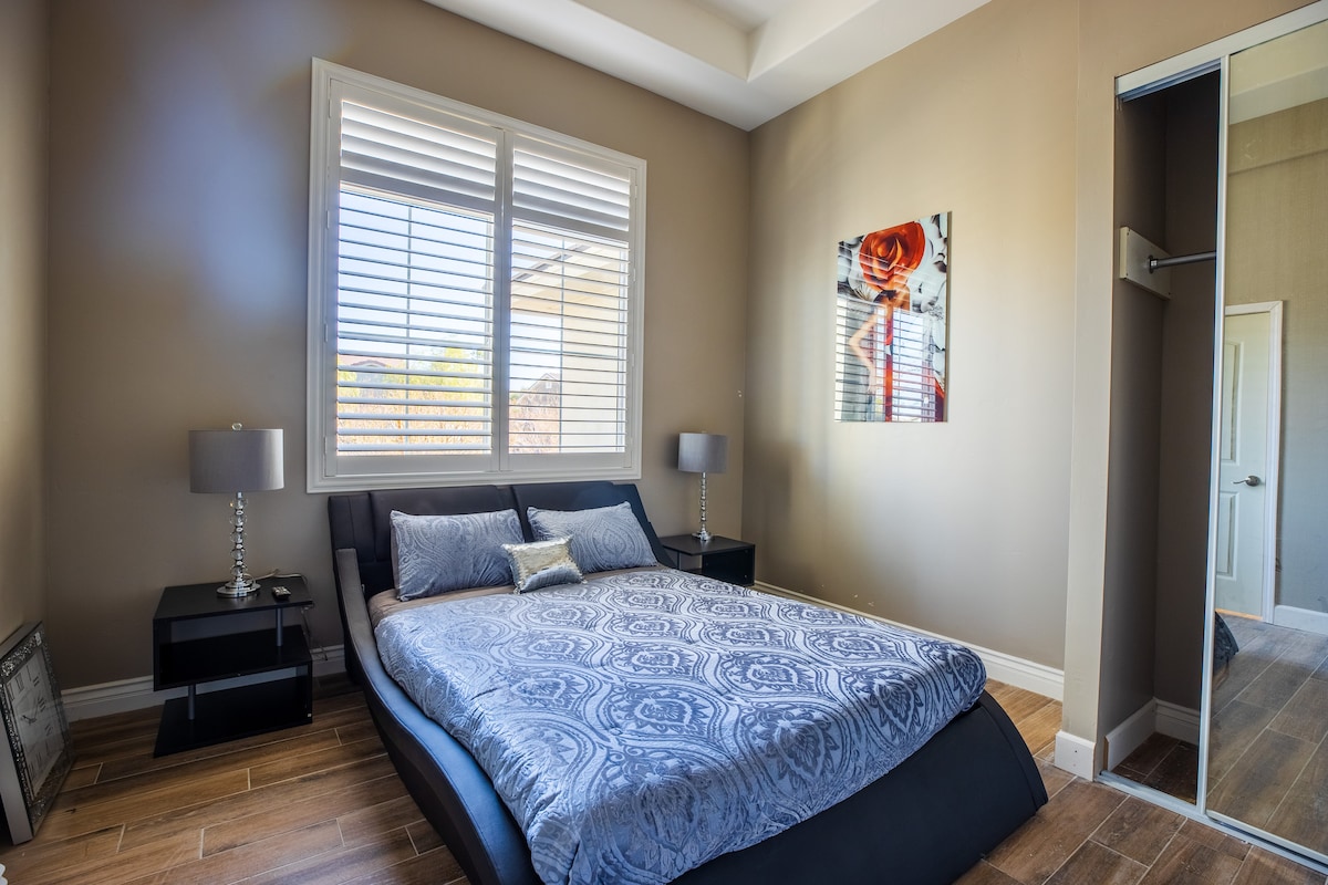 HendersonWelcome to my modern completely remodeled 3400 square foot house! Strip views from the backyard, master bedroom and living room. Very spacious and accommodates up to 12 people comfortably. 40 foot heatable pool and jacuzzi. Basketball court, golf putting green and a huge kitchen island. Has 5 bedrooms with 4 of them having an in suite personal bathroom. High speed internet and a basic cable subscription. Each Bedroom has it's own smart TV and the living room has a huge smart TV.