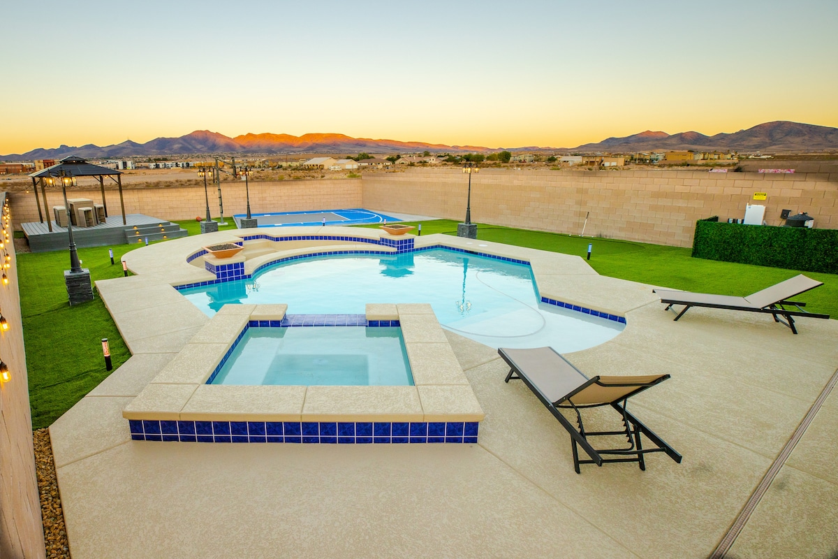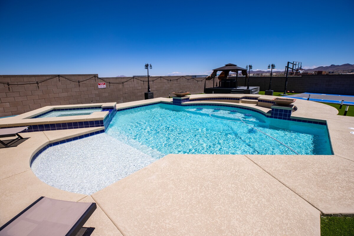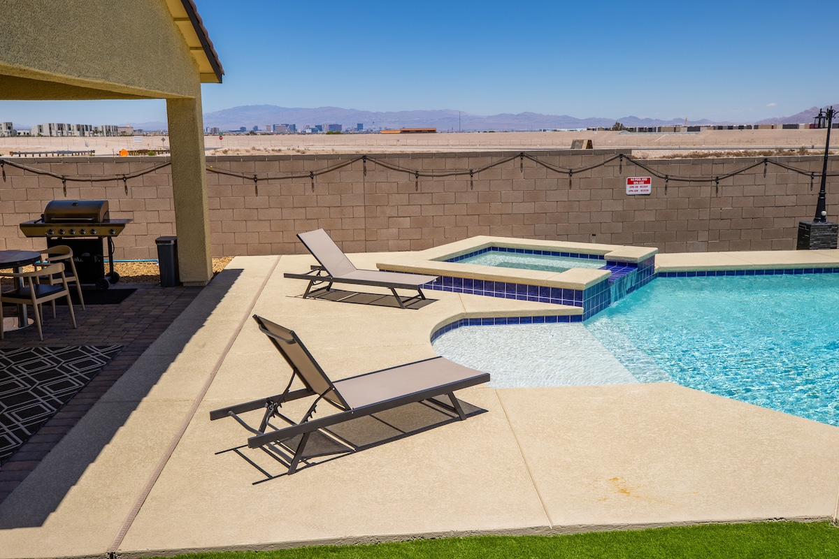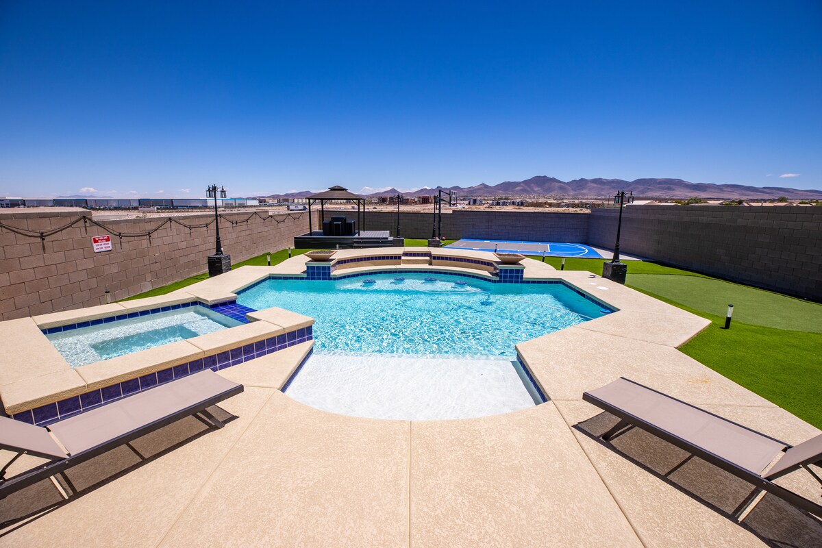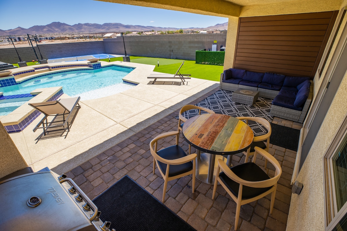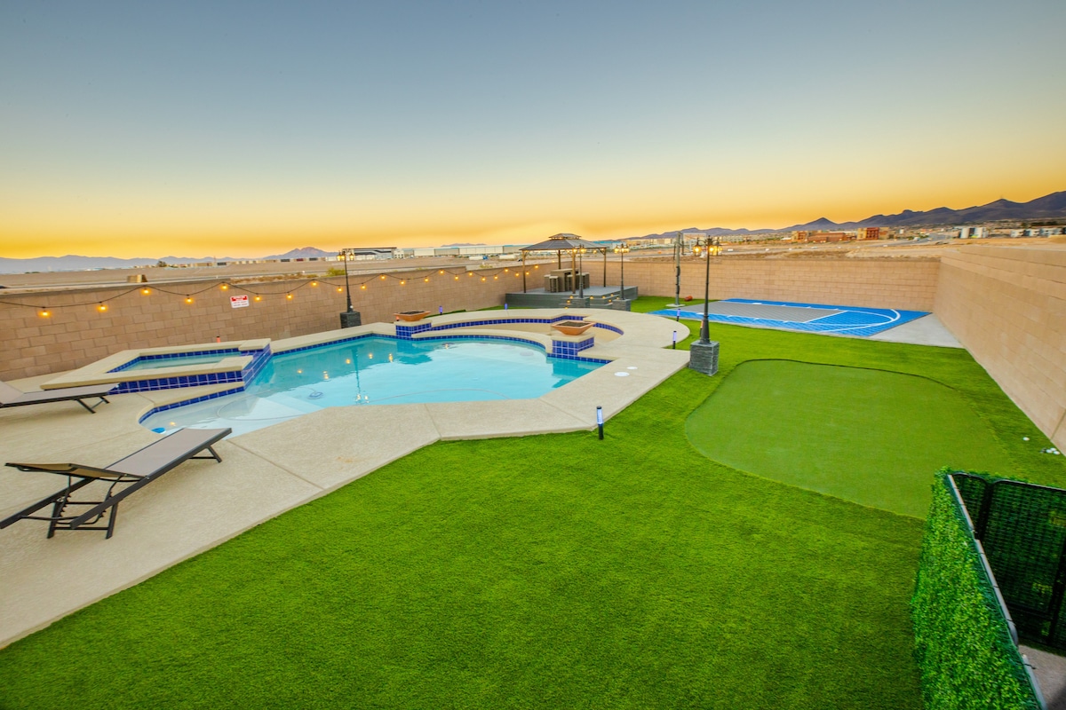 HendersonWelcome to my modern completely remodeled 1900 square foot house!. Basketball court, golf putting green and a decking with a strip view. Sunken pit sitting area. House was built in 2019 and nobody lived in it until 2022. Amazingly beautiful views from the backyard and house. Very spacious and accommodates up to 8 people comfortably. 25 foot heatable pool and jacuzzi. High speed internet and a basic cable subscription. Each bedroom has it's own smart TV and the living room has a huge smart TV.