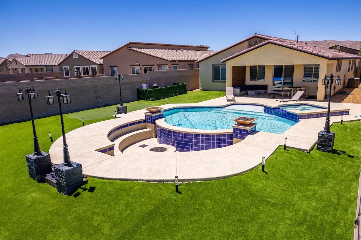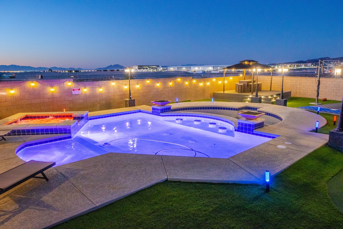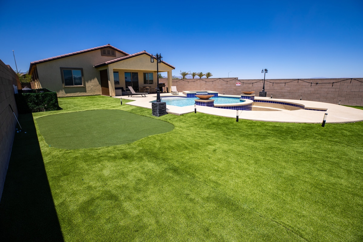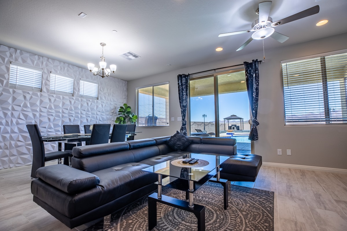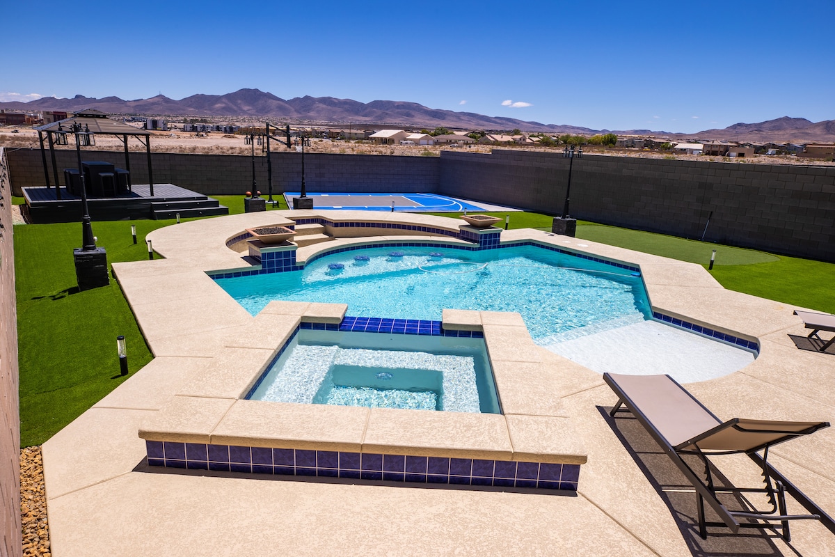 HendersonWelcome to my modern completely remodeled 1900 square foot house!. Basketball court, golf putting green and a decking with a strip view. Sunken pit sitting area. House was built in 2019 and nobody lived in it until 2022. Amazingly beautiful views from the backyard and house. Very spacious and accommodates up to 8 people comfortably. 25 foot heatable pool and jacuzzi. High speed internet and a basic cable subscription. Each bedroom has it's own smart TV and the living room has a huge smart TV.