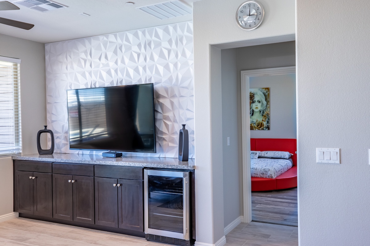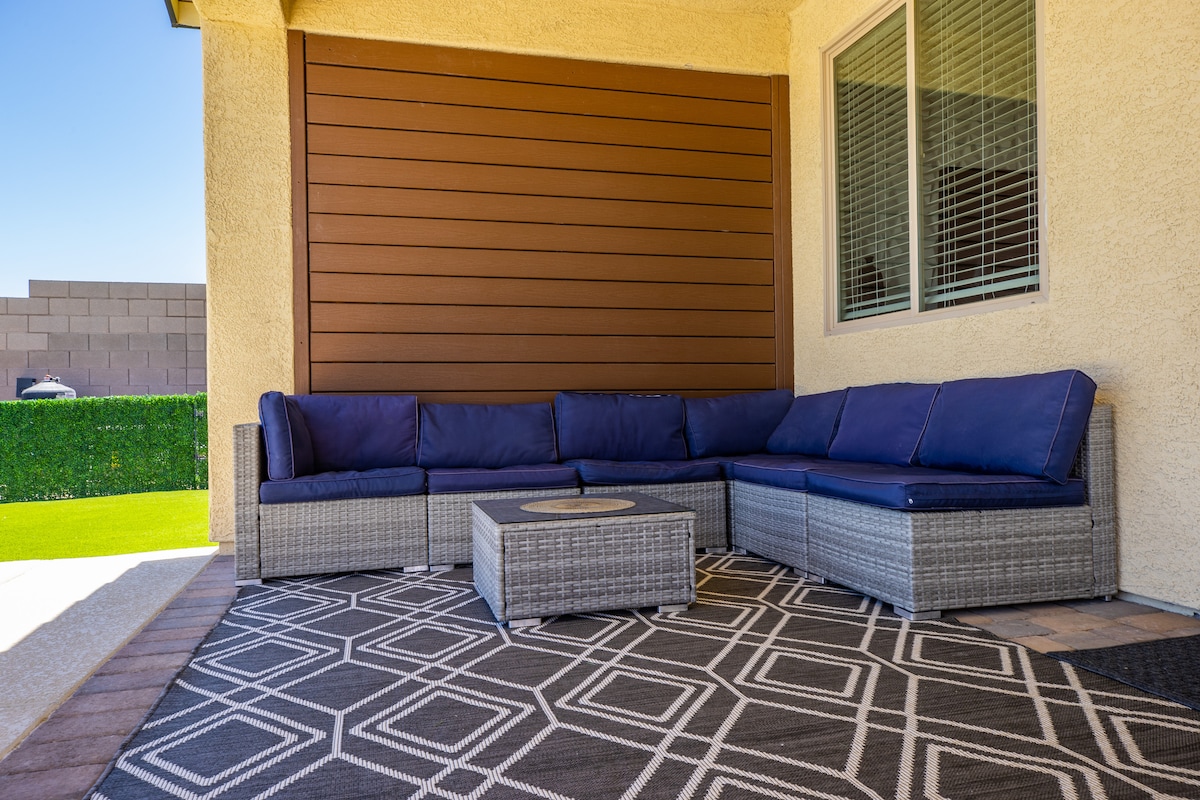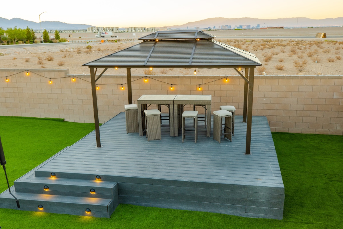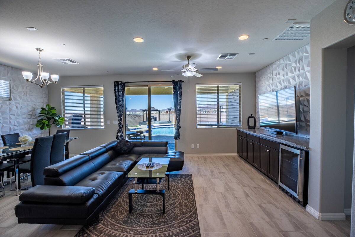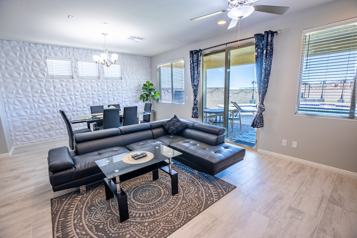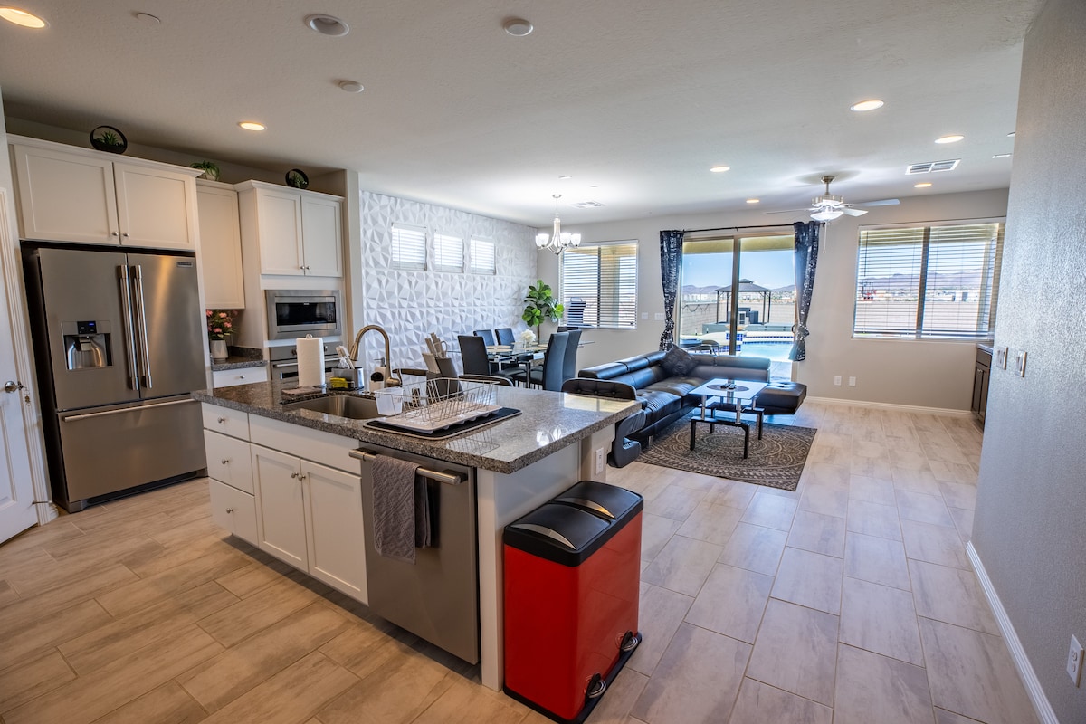 HendersonWelcome to my modern completely remodeled 1900 square foot house!. Basketball court, golf putting green and a decking with a strip view. Sunken pit sitting area. House was built in 2019 and nobody lived in it until 2022. Amazingly beautiful views from the backyard and house. Very spacious and accommodates up to 8 people comfortably. 25 foot heatable pool and jacuzzi. High speed internet and a basic cable subscription. Each bedroom has it's own smart TV and the living room has a huge smart TV.